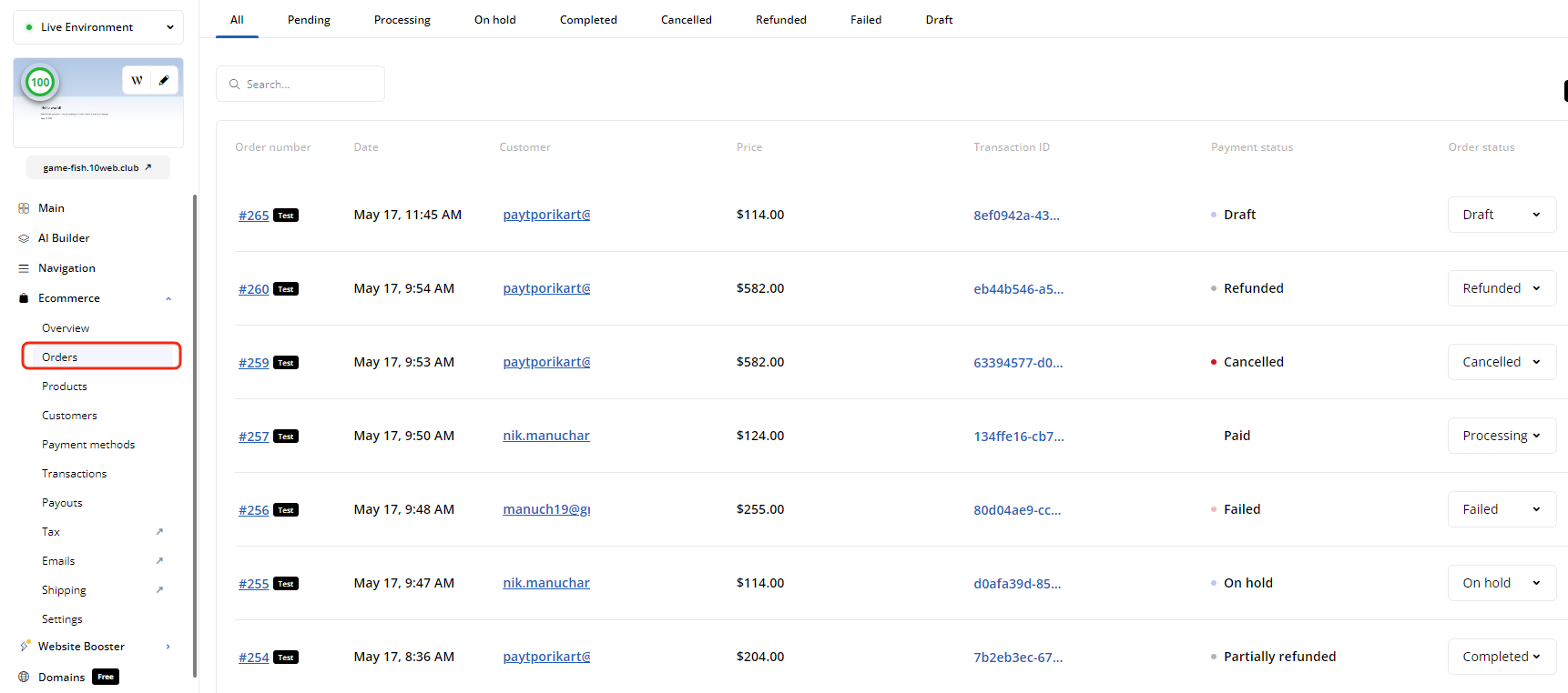 - Order Type: The orders that do not go through a 10Web Payment method, but are processed using other payment methods, wouldn't have a transaction ID mentioned on 10Web Dashboard.
